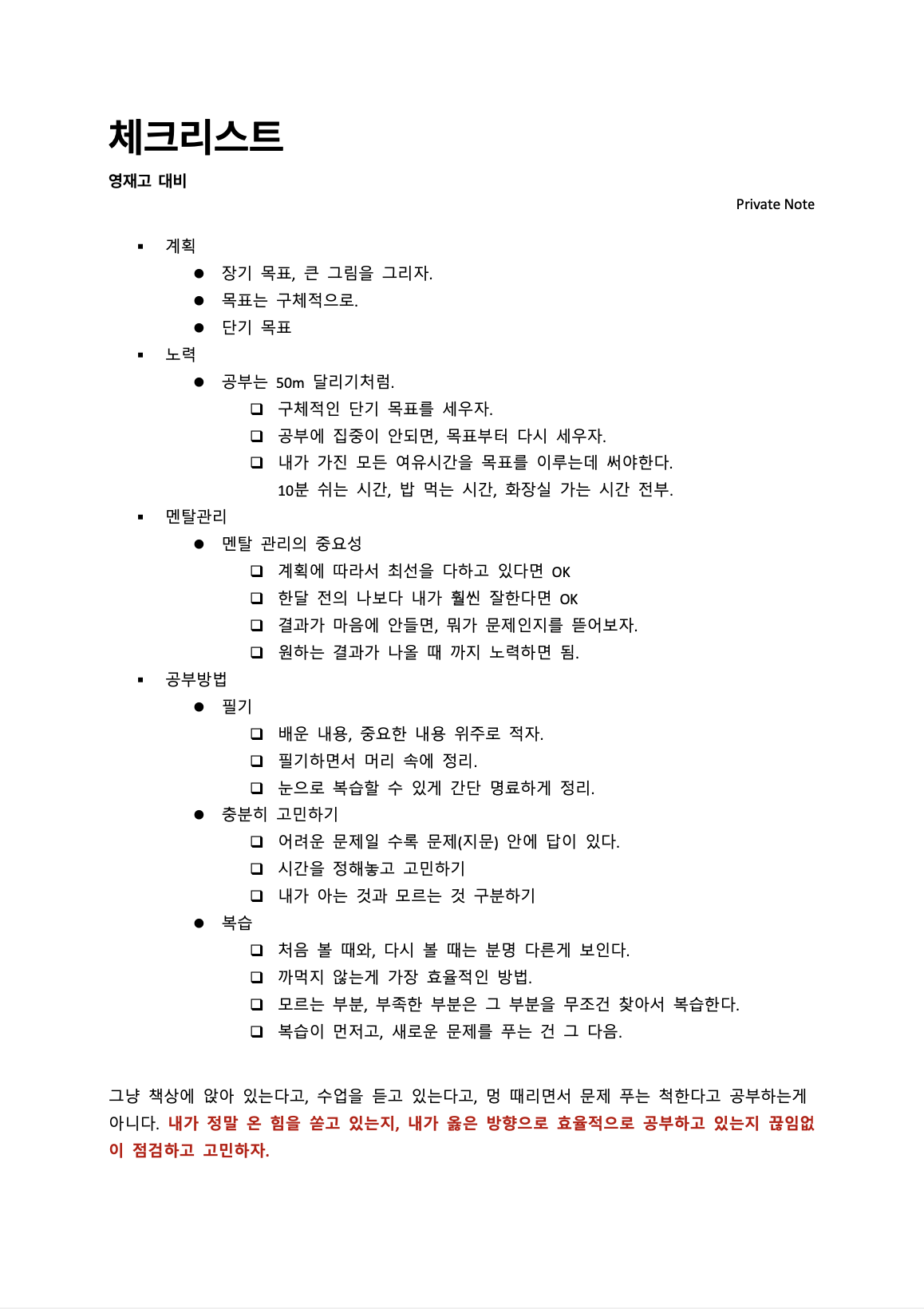 어제 설명회에서 아이들에게 설명했던 공부 방법에 대한 체크리스트입니다.