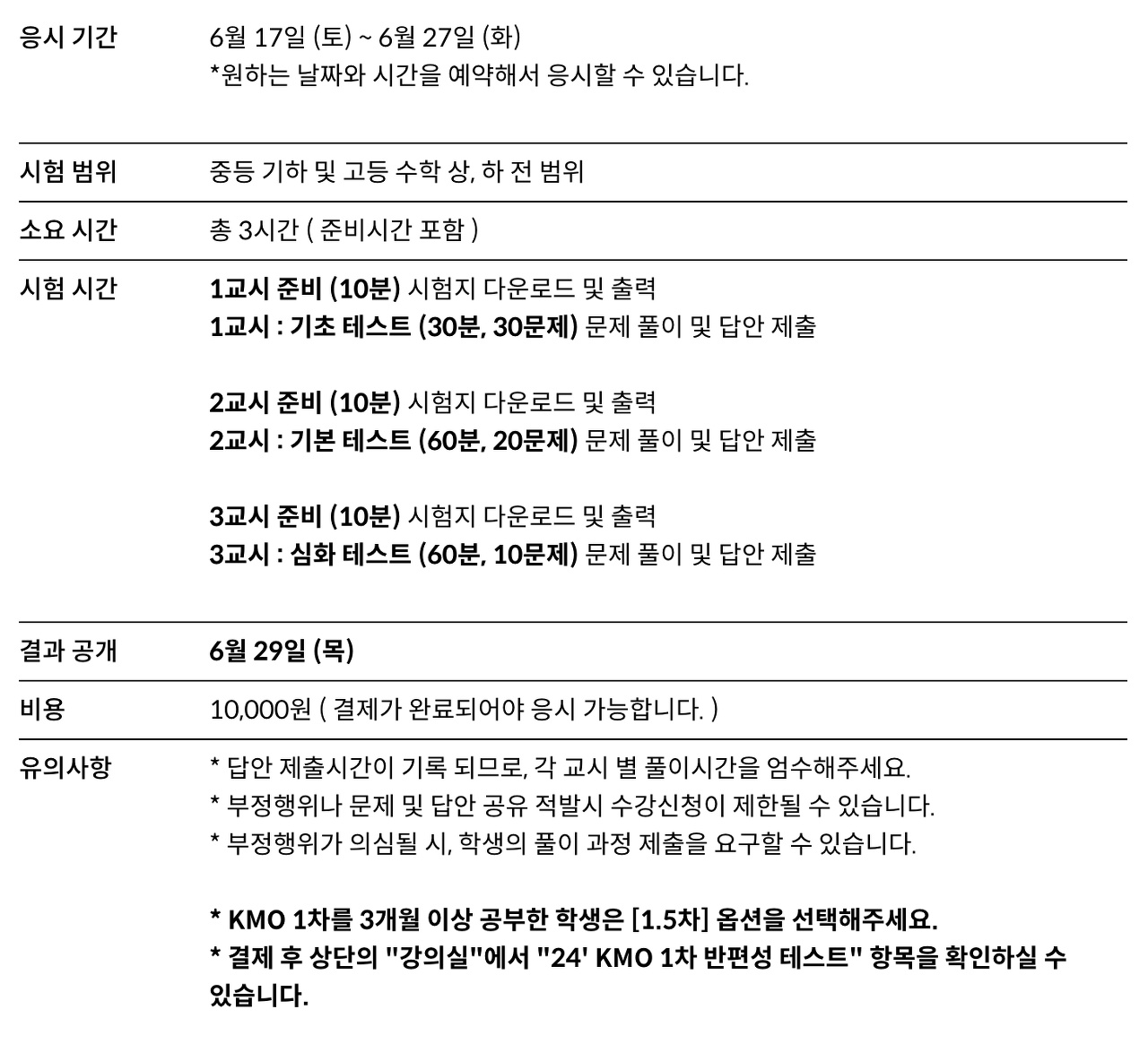 - KMO 공부를 3개월 이상해서 이론을 어느 정도 알고 있는 학생들은 1.5차반에 응시해주세요.