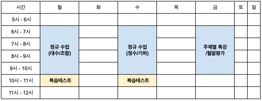 KMO 1차 대비반 시간표 (7, 9, 11월반 동일)
