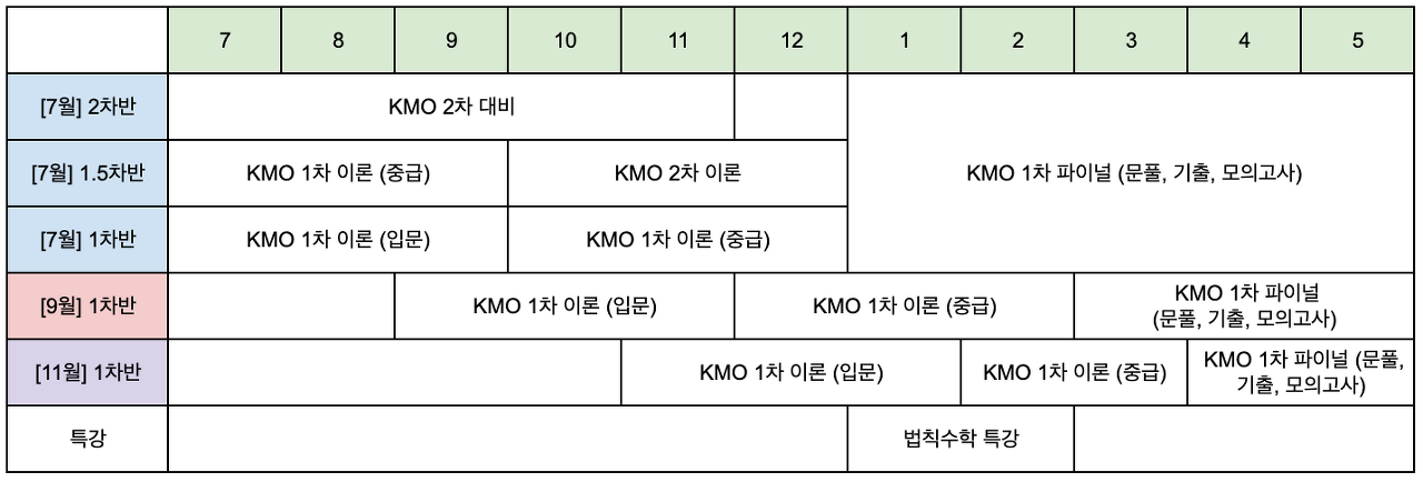 KMO 1차 대비반 시간표 (7, 9, 11월반 동일)