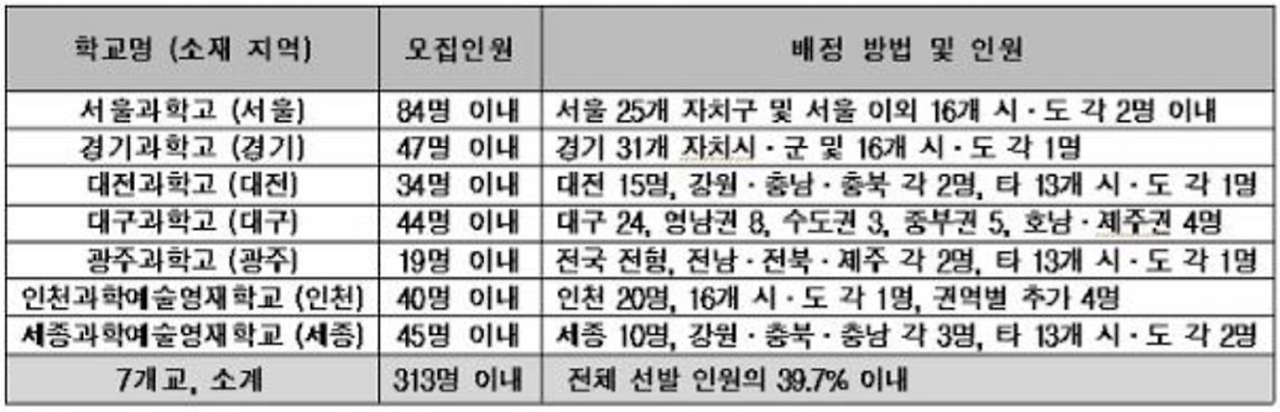 대전영재고는 대전 지역에 15명을 배정합니다. 5개의 자치구에서 2명씩 뽑고 자치구를 가리지 않고 5명을 뽑는다고 합니다. 대전도 학군지가 뚜렷하게 형성된 곳이다 보니, 학군지에는 7명이 배정된다는 얘기네요.