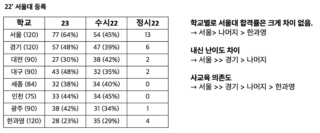 - 한과영의 경우 카이스트 선호도가 높아서 서울대를 적게 보냅니다.