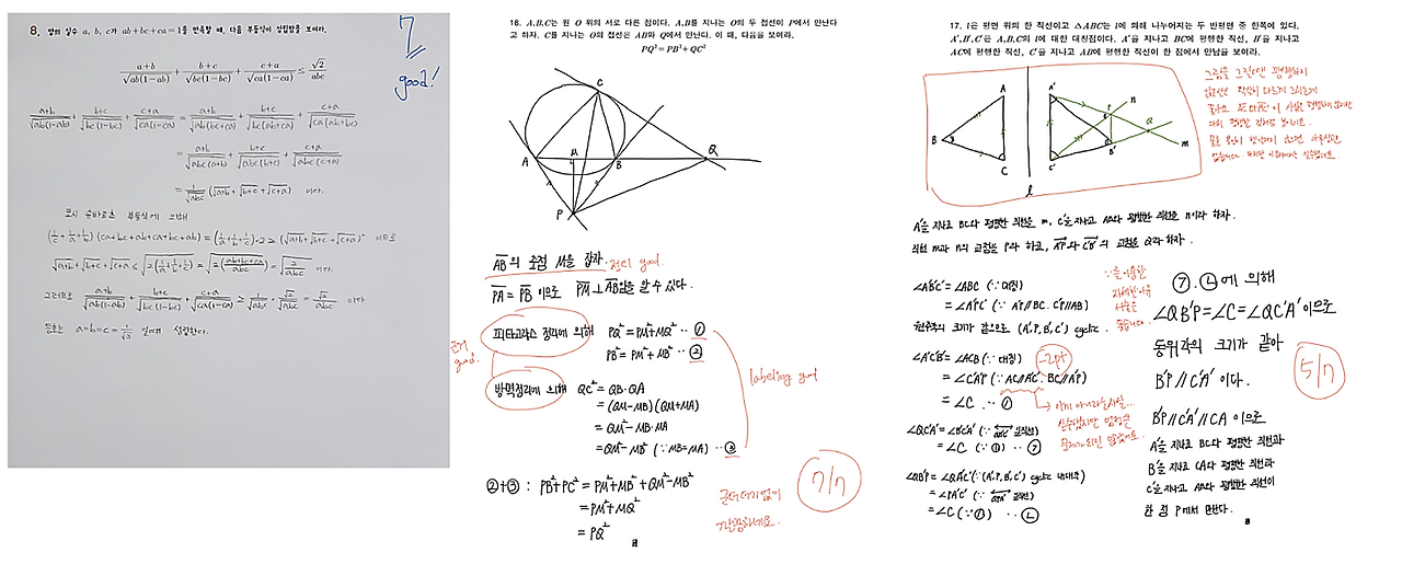 반대로 서술 첨삭을 제대로 경험해보지 않은 친구들은, 그냥 핵심 아이디어만 떠올리는데 집중합니다. 그러면 본인 생각이 진짜 증명을 한 건지, 아니면 소설을 쓴 것인지 스스로 구분할 수 있는 능력을 갖추지 못합니다. 그래서 KMO 시험에서 6문제를 풀고도 장려상을 받는 경우가 생기는거죠.