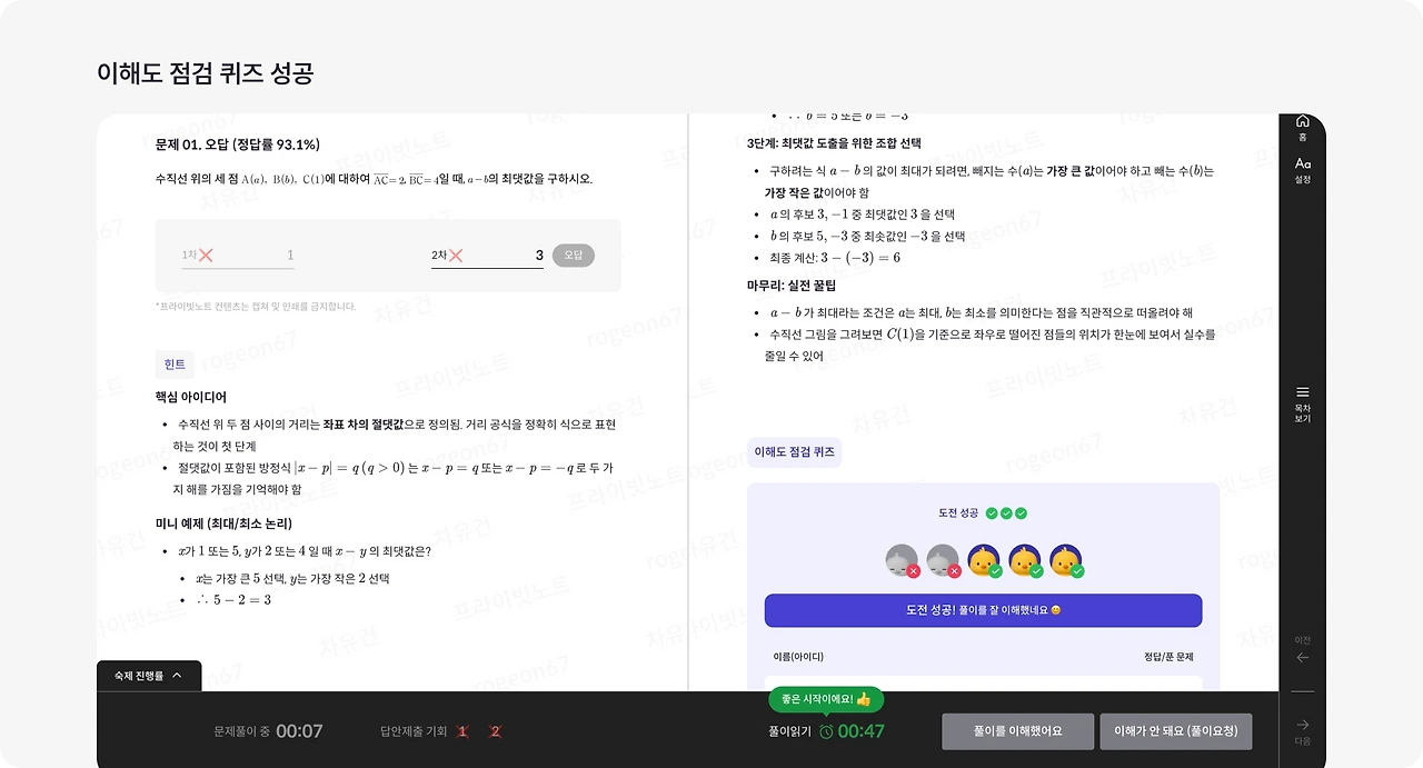 그래서 프라이빗노트에서는 “맞췄는지 또는 풀었는지”가 아니라 “이해했는지”를 확인하기 위해 이해도 점검 퀴즈를 도입했습니다.