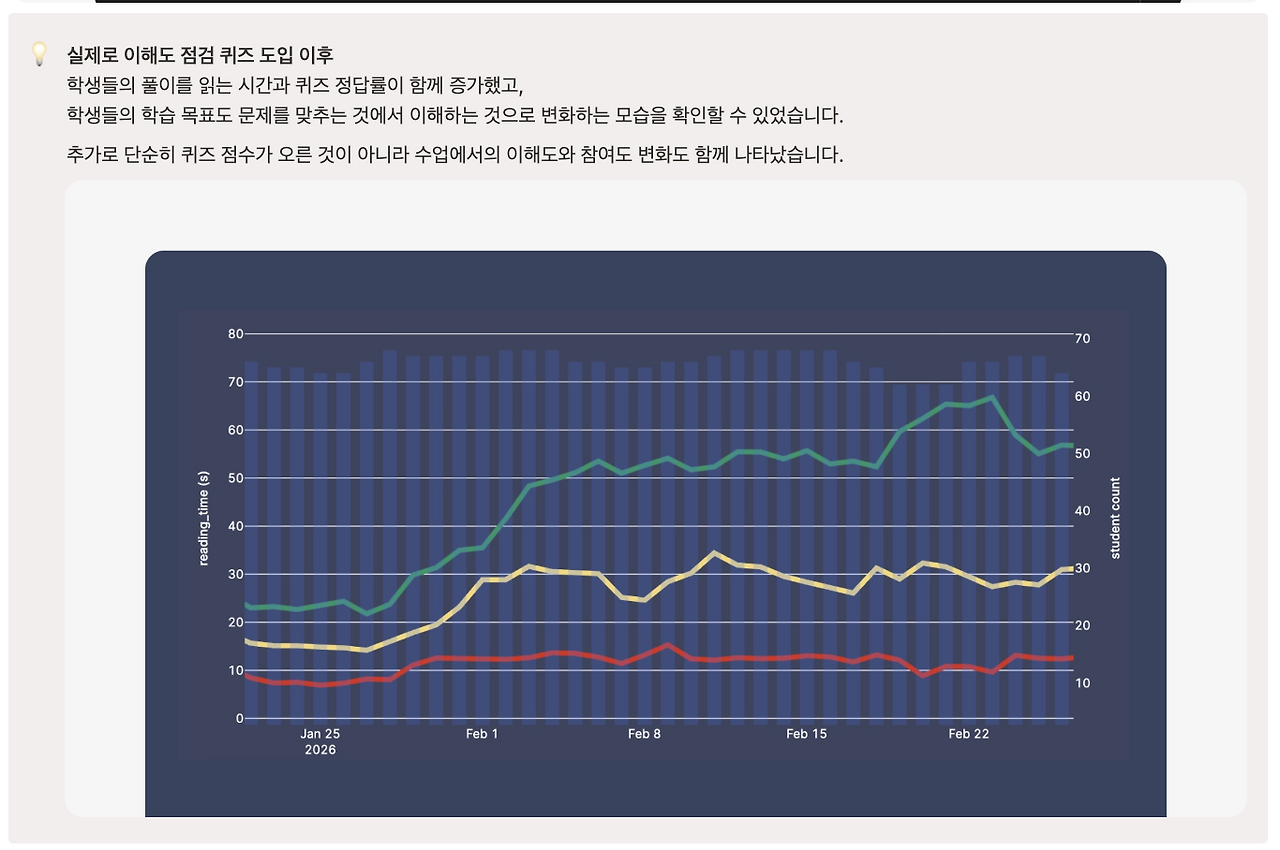 - 실제 데이터를 보면 대부분 과목에서 이해도 점검 퀴즈를 제대로 풀기 위해 필요한 시간은 평균 약 12초 정도였습니다.