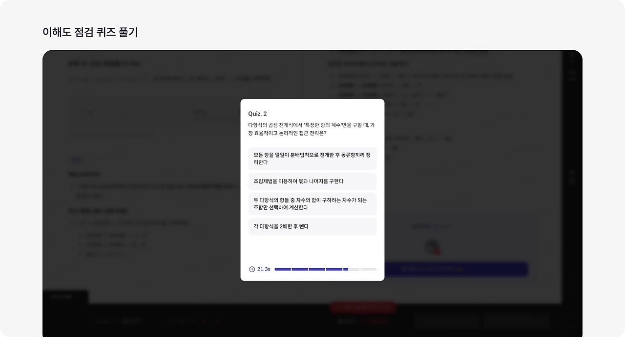 ❶ 이해도 점검 퀴즈 문제가 나타난 뒤 → 5초 후에 선택지(보기)가 표시됩니다.
